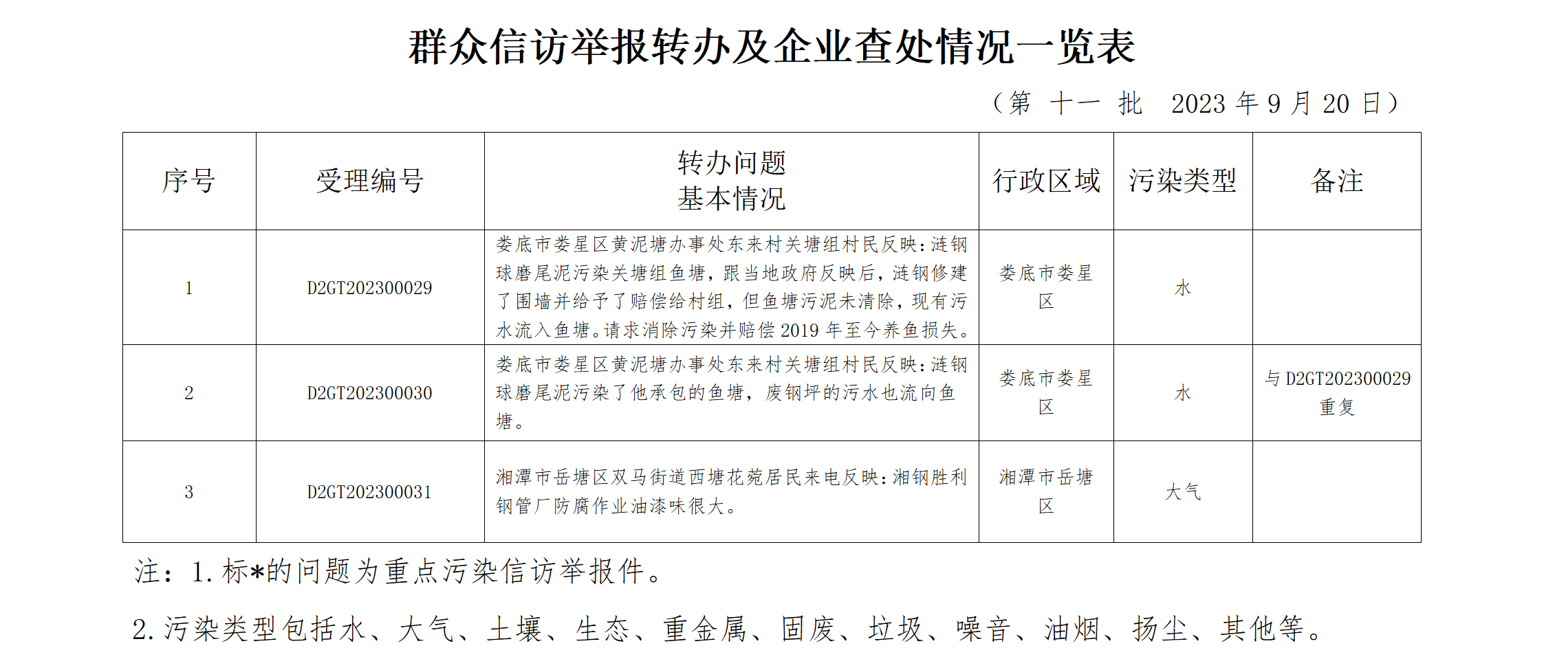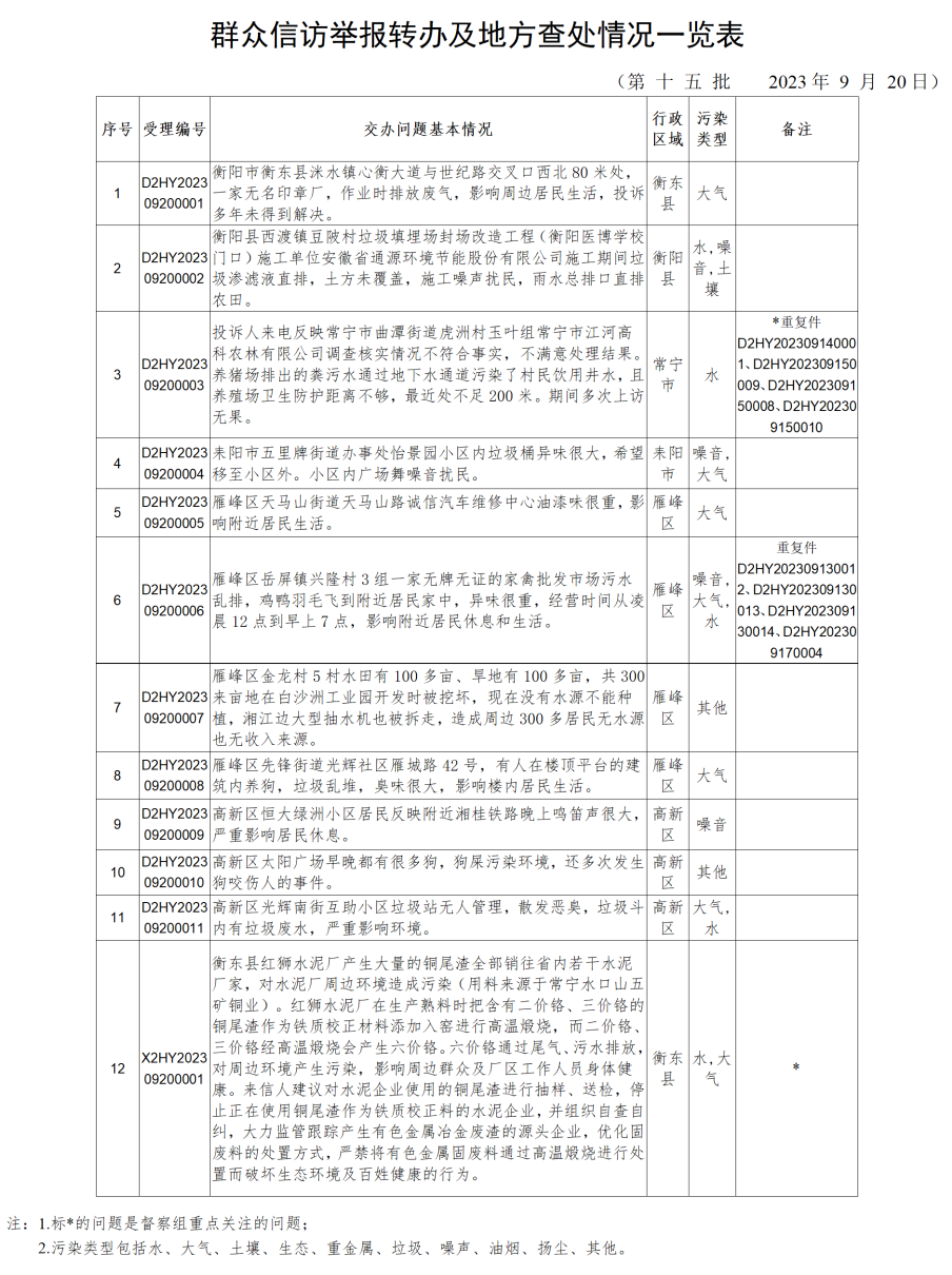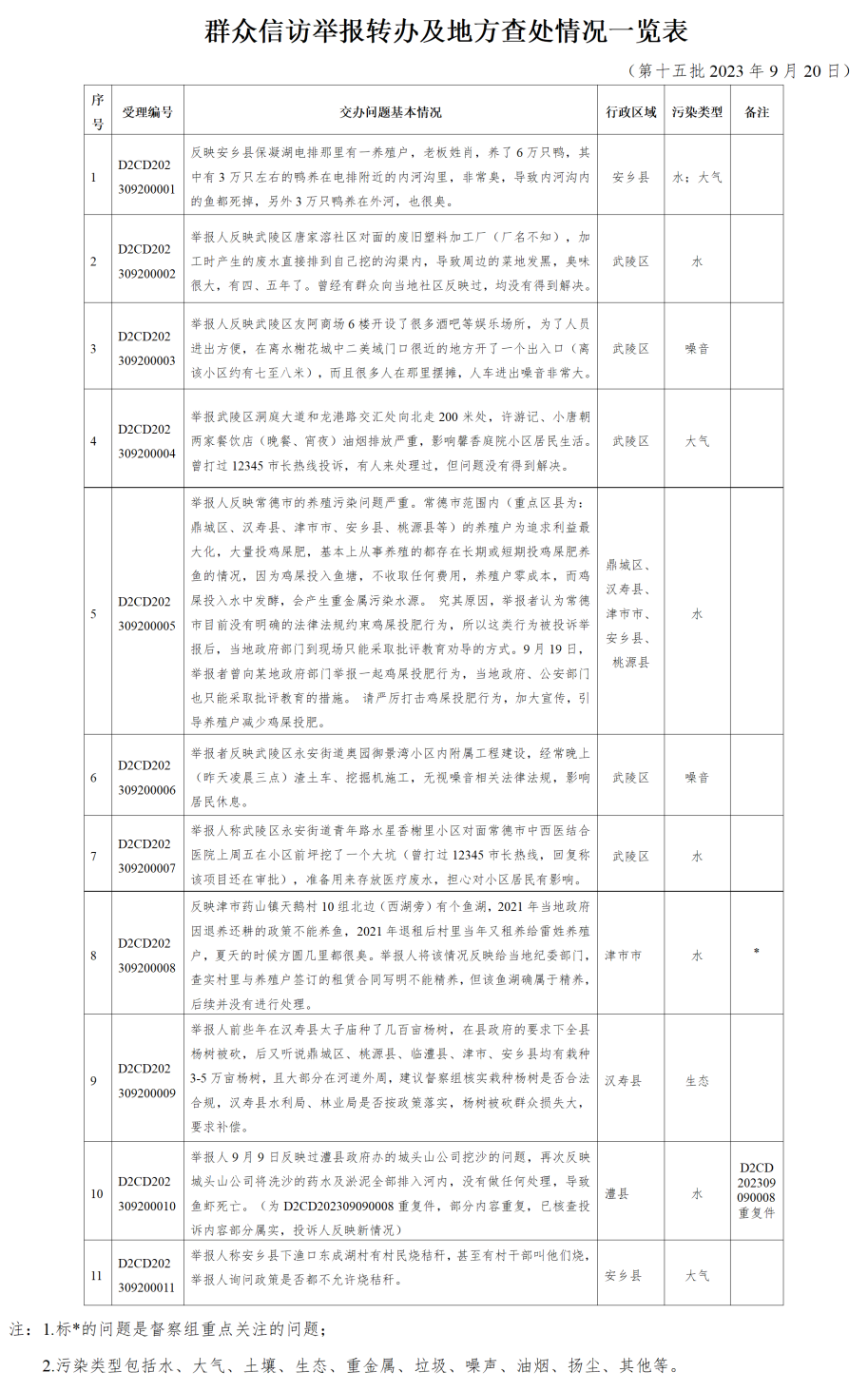 2023年9月20日,省生态环境保护督察组分别向衡阳、常德、湖南钢铁集团有限公司、湖南省煤业集团有限公司、湖南有色产业投资集团有限责任公司交办群众举报件,共26件。