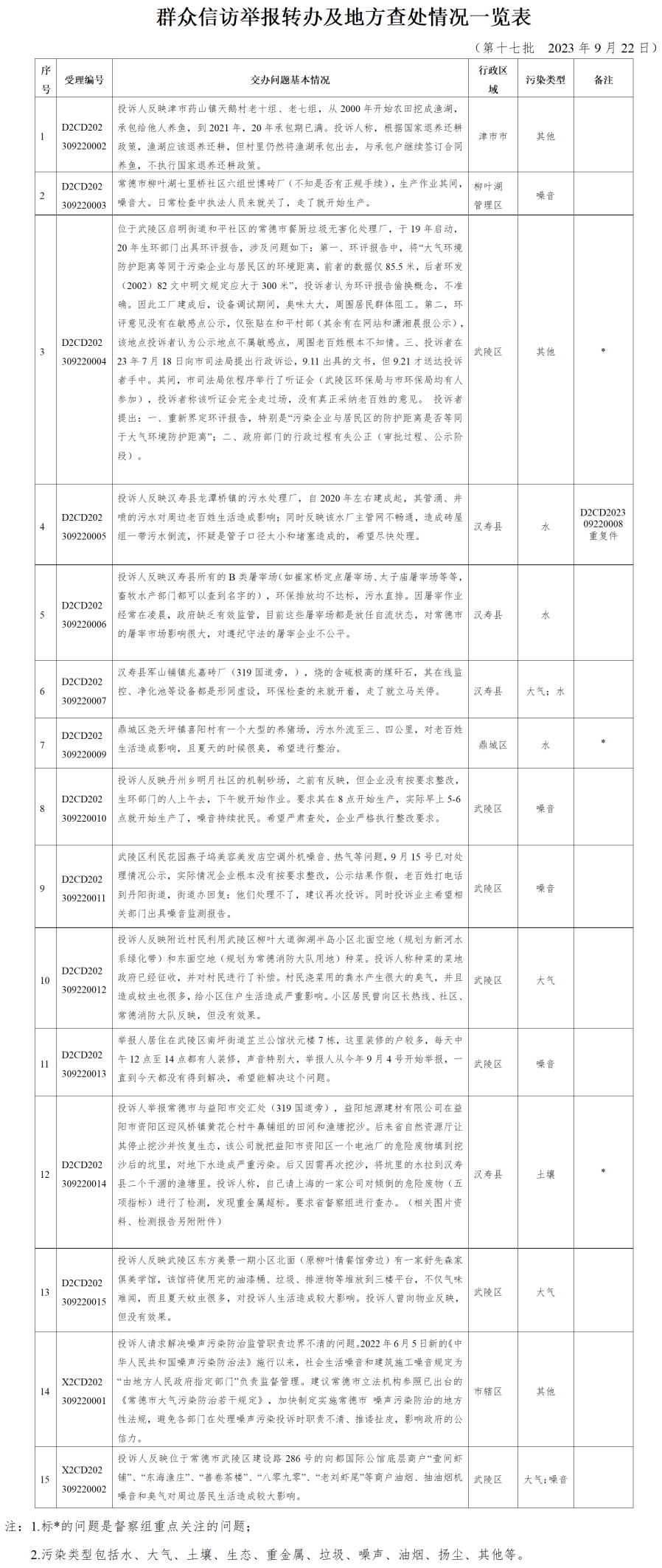 2023年9月22日,省生态环境保护督察组分别向衡阳、常德、湖南钢铁集团有限公司、湖南省煤业集团有限公司、湖南有色产业投资集团有限责任公司交办群众举报件,共21件。