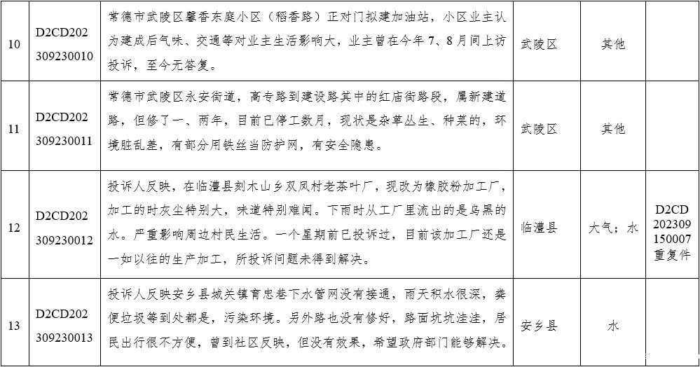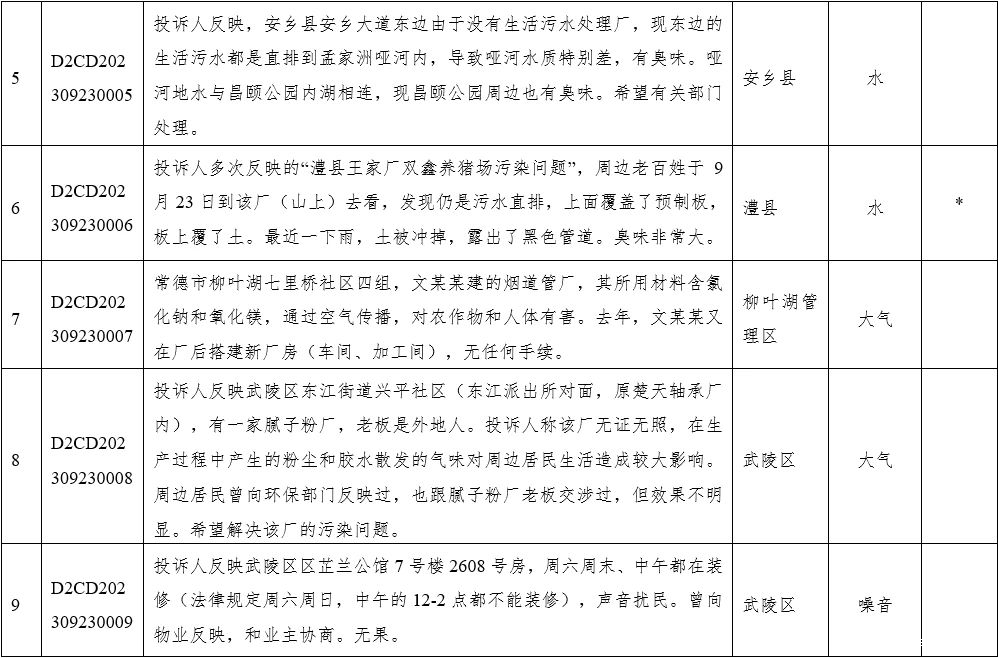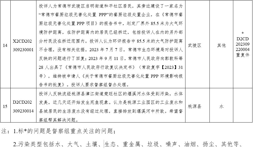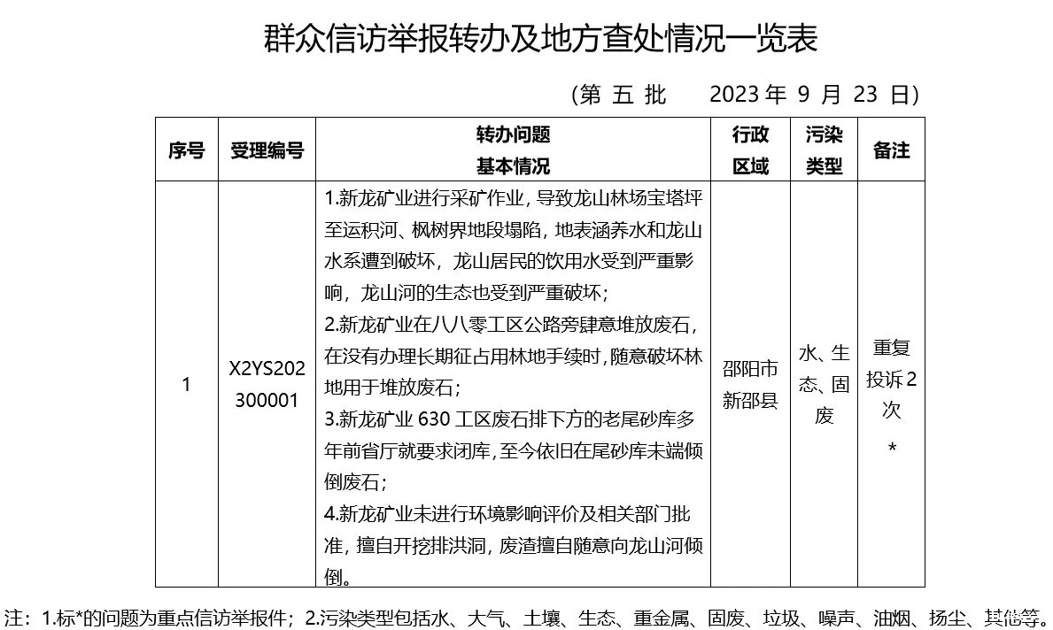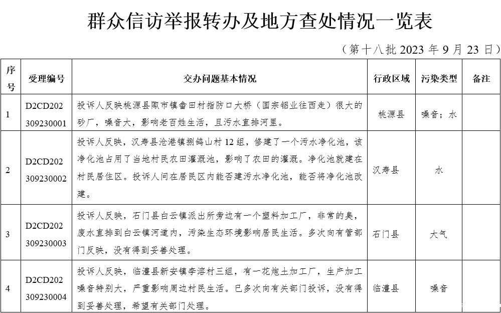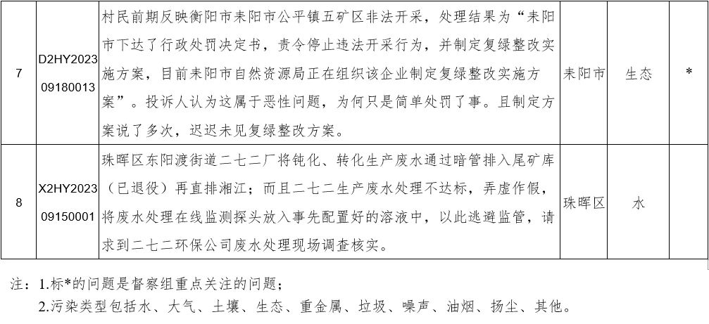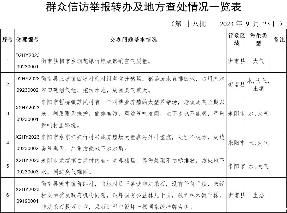 2023年9月23日,省生态环境保护督察组分别向衡阳、常德、湖南钢铁集团有限公司、湖南省煤业集团有限公司、湖南有色产业投资集团有限责任公司交办群众举报件,共24件。