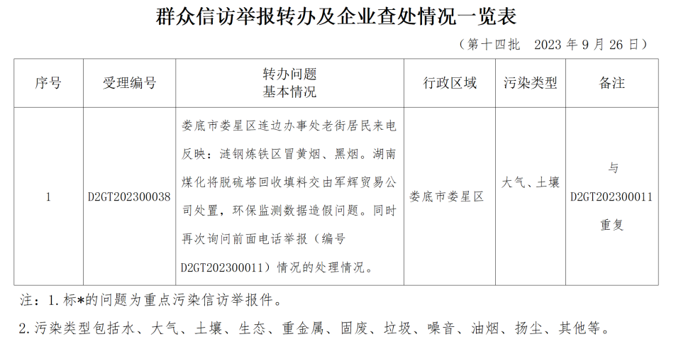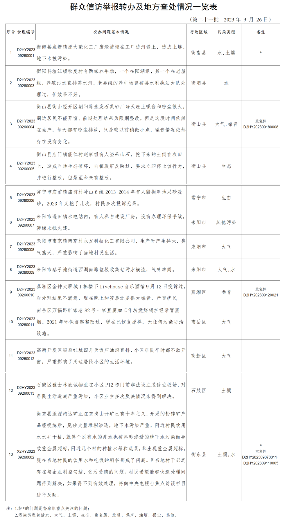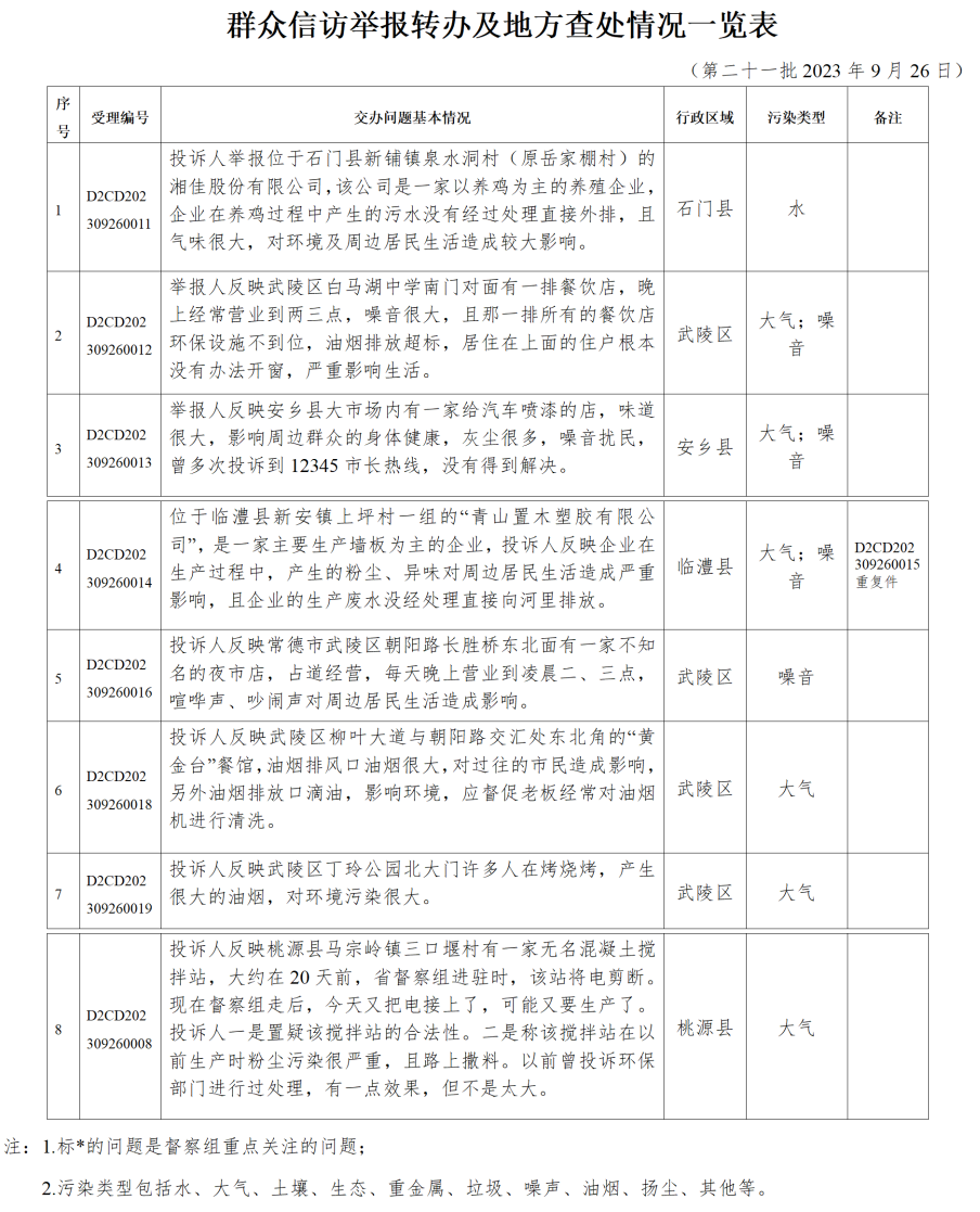 2023年9月26日,省生态环境保护督察组分别向衡阳、常德、湖南钢铁集团有限公司、湖南省煤业集团有限公司、湖南有色产业投资集团有限责任公司交办群众举报件,共22件。