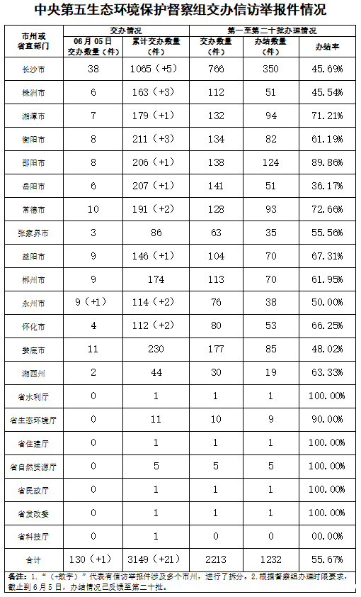 中央第五生态环境保护督察组今天向湖南交办群众信访举报件130件(来电举报72件,来信举报58件),其中重点件10件。我省分解后交办131件,其中重点件10件。