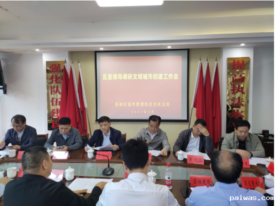 5月18日下午3点,区委副书记、区创建办主任于德辉、区委常委、宣传部长、区创建办常务副主任符文彬、副区长、区创建办副主任杨雪峰、区政协副主席、商务局长黄文洁以及两名区政协委员李凤发、何国友一行,到我局调研文明城市创建工作,局全体班子成员及二级机构负责人参加了会议。