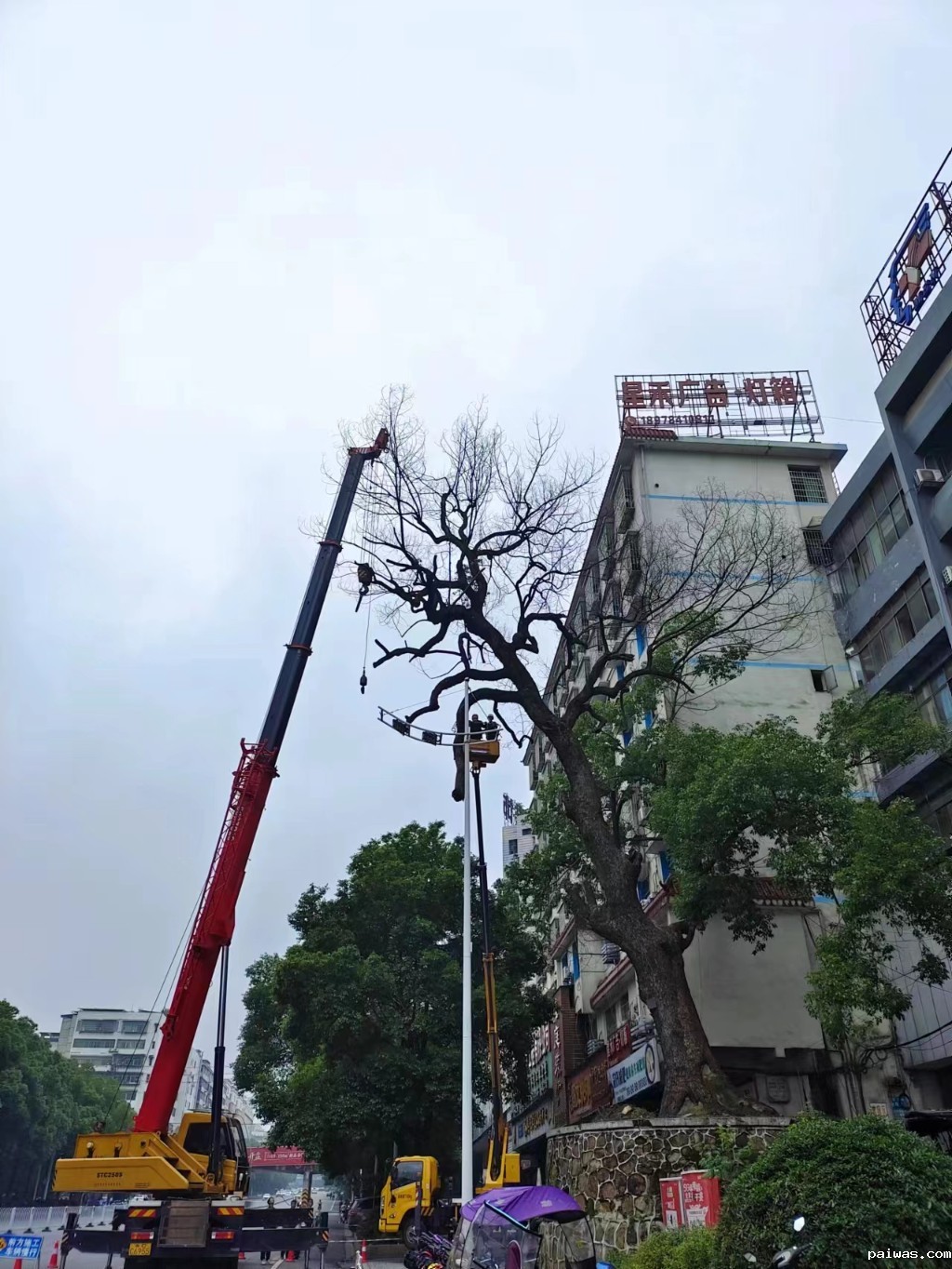 5月27日上午,蒸湘区园林绿化所对蒸湘南路一株树龄340年的古香樟进行复壮作业,全力抢救雁城绿色“活化石”。古树位于蒸湘南路2号附近地段,古树上半部分已枯干发黑,树高20米,绿化养护人员加紧对古树修剪整形,及时消除了安全隐患。