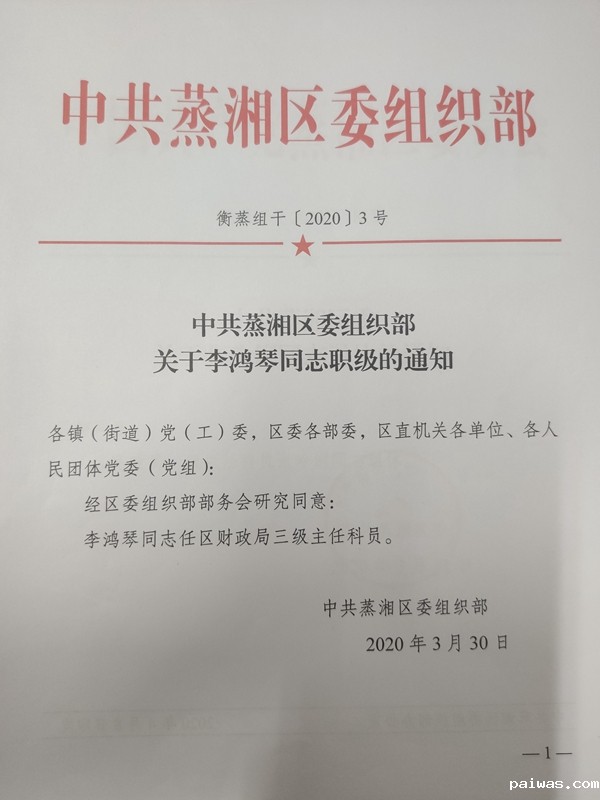 衡蒸组干〔2020〕3号 关于李鸿琴同志职级的通知