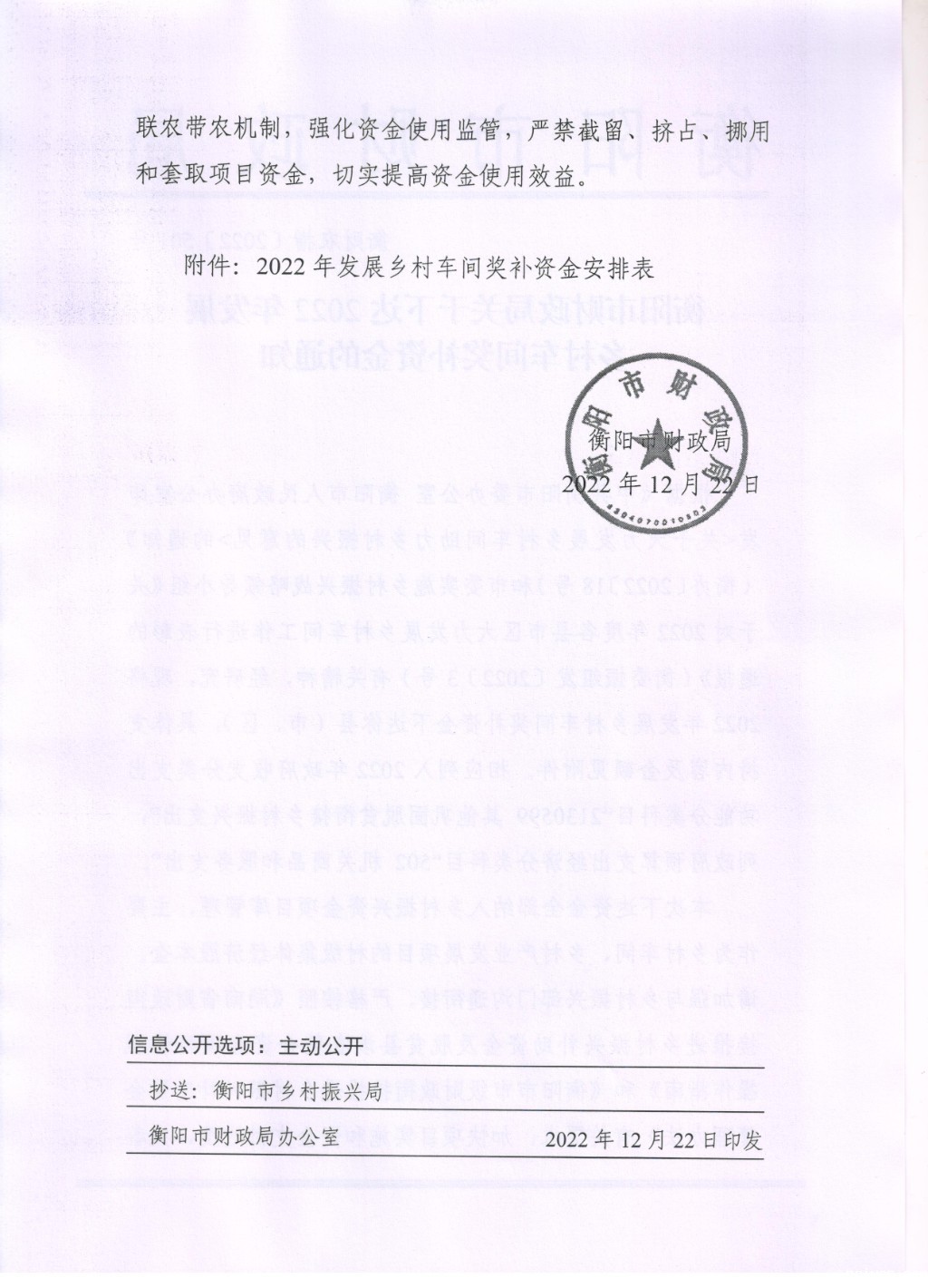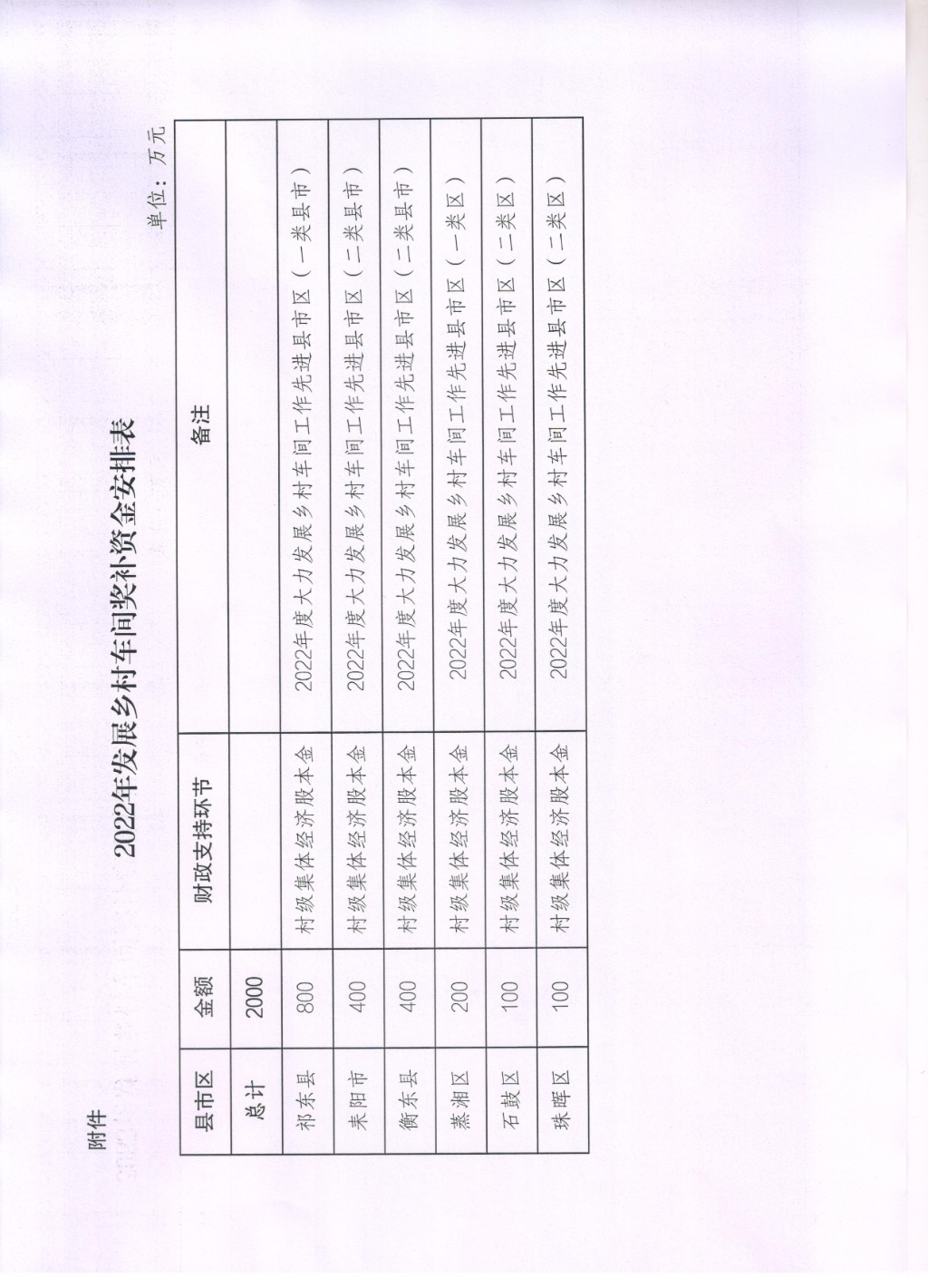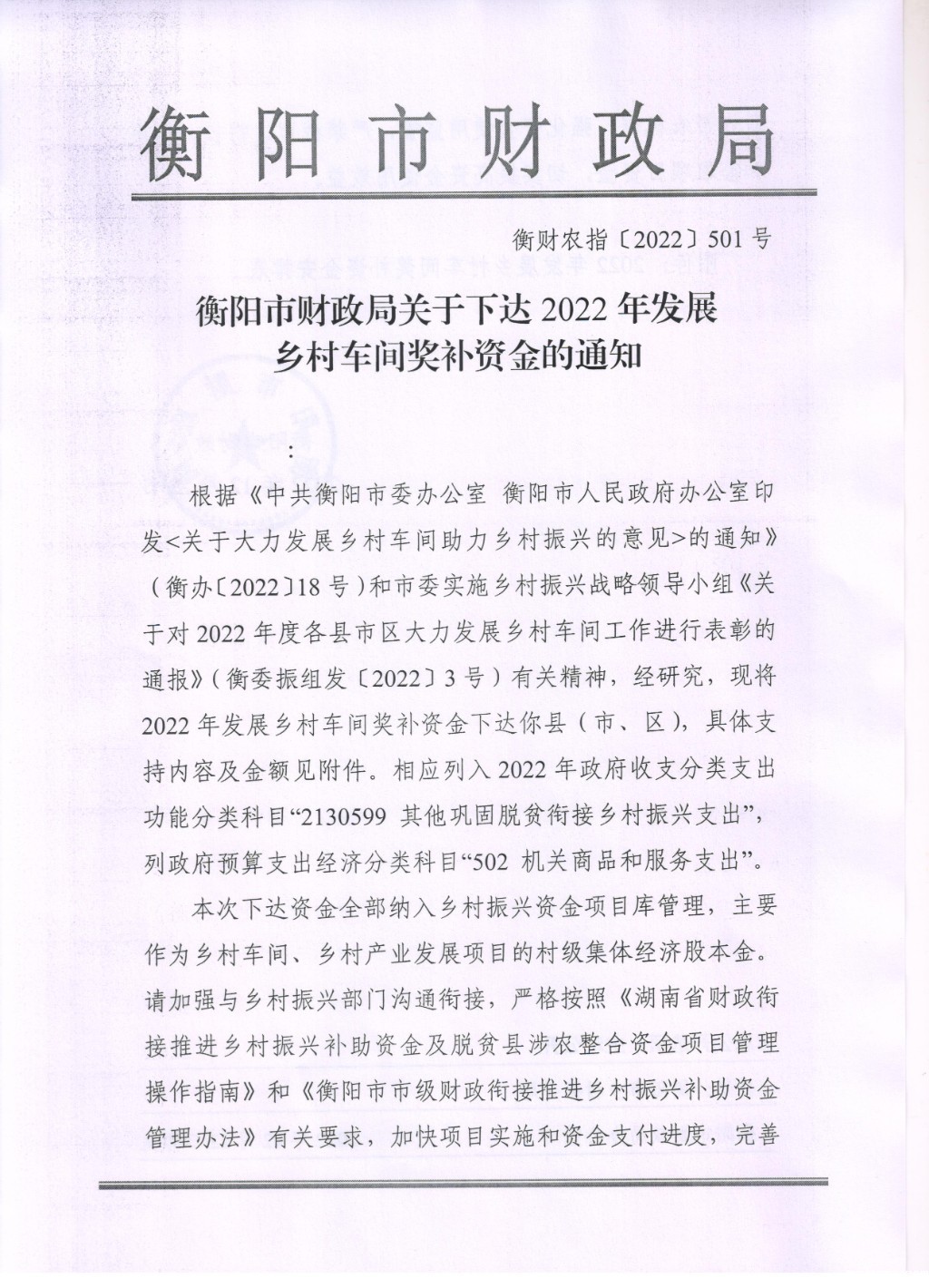 衡阳市财政局关于下达2022年发展乡村车间奖补资金的通知