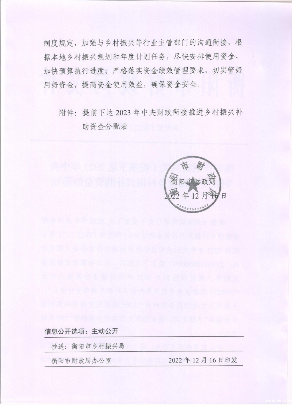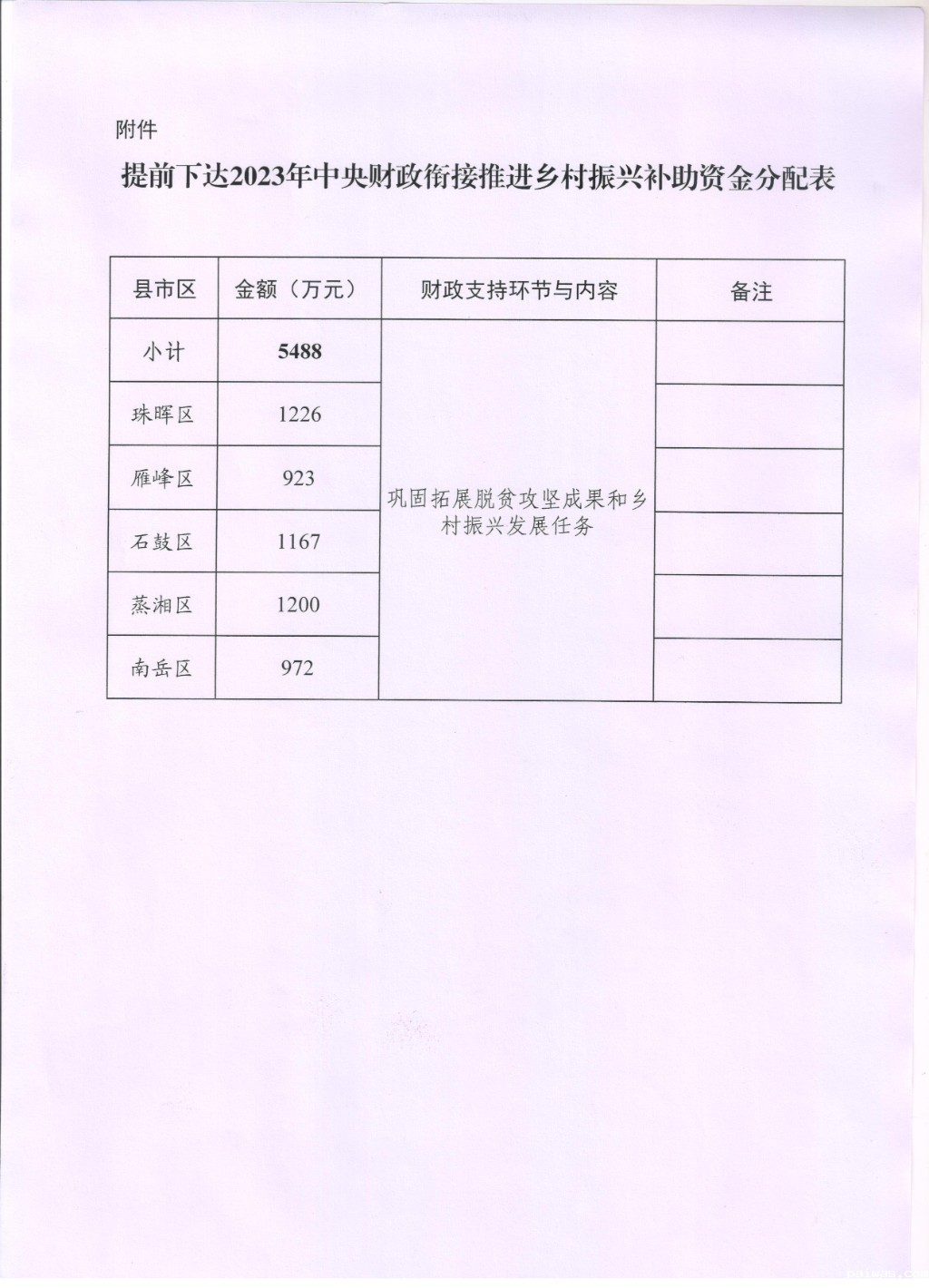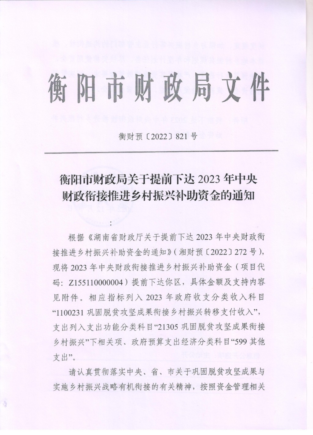 衡阳市财政局关于提前下达2023年中央财政衔接推进乡村振兴补助资金的通知