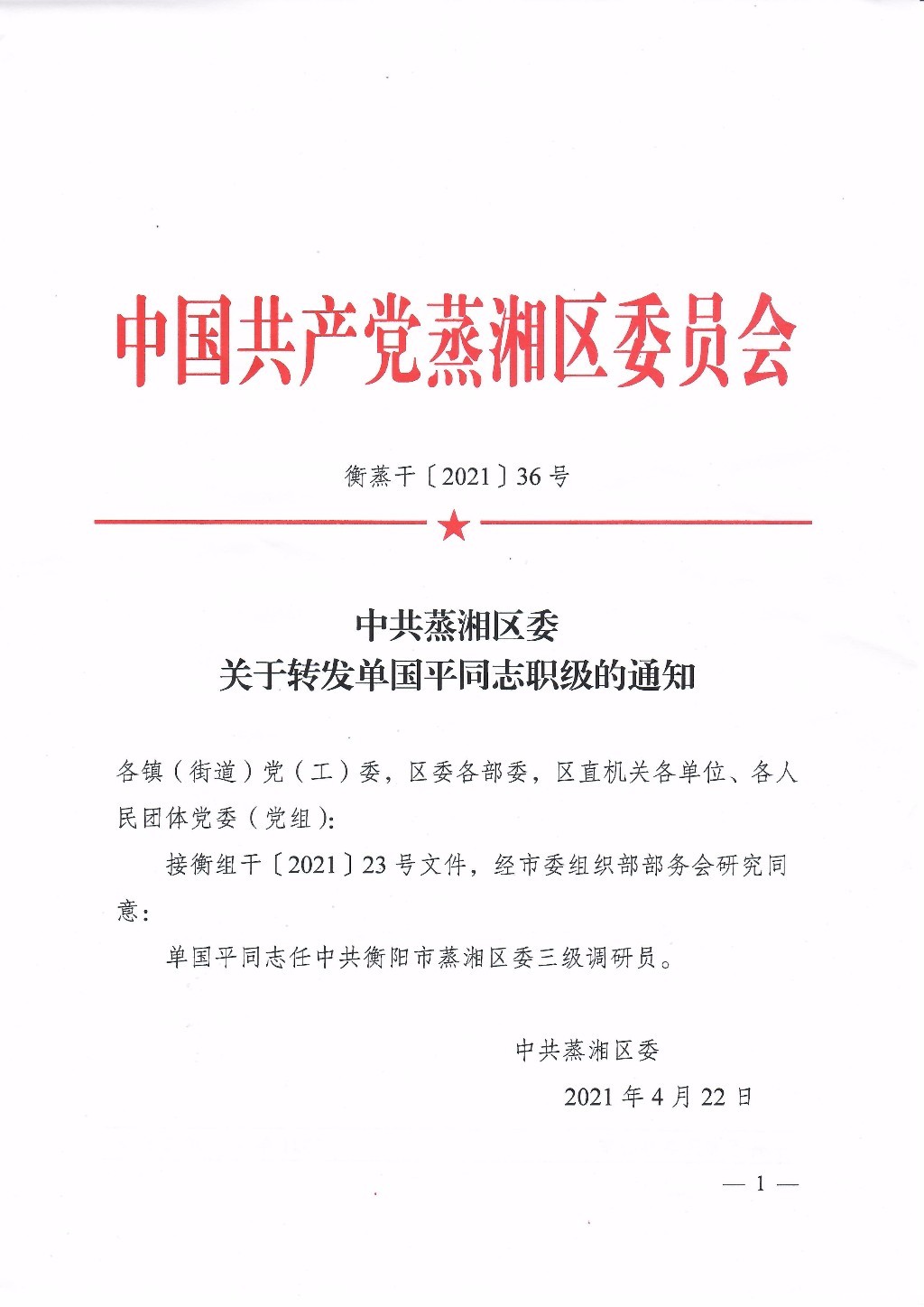 关于转发单国平同志职级的通知
