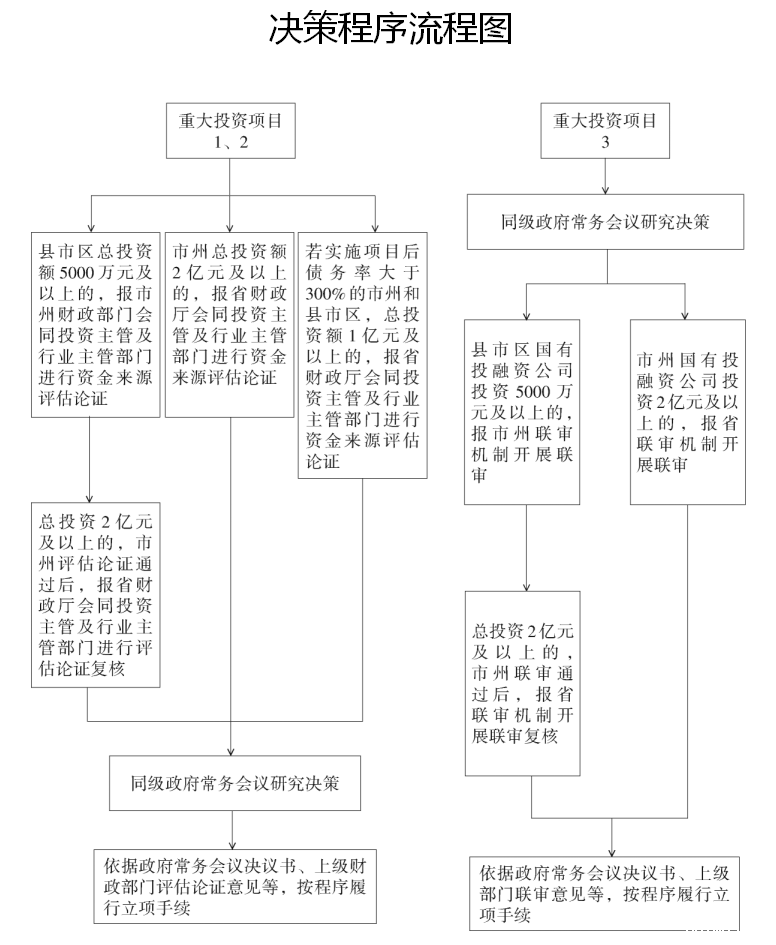 (三)符合第(一)条第1、2种情形的重大政府性投资项目,必须使用财政资金、政府债券资金,不得违规使用市场化融资新增政府隐性债务。在同级政府常务会议研究决策前,须由上级财政部门对资金来源进行评估论证。其中,县市区级总投资额5000万元及以上的,须报所在市州财政部门会同投资主管及行业主管部门进行资金来源评估论证;总投资额2亿元及以上的,在完成市州评估论证程序后,还须报省财政厅会同投资主管及行业主管部门进行评估论证复核。市州级总投资额2亿元及以上的,须报省财政厅会同投资主管及行业主管部门进行资金来源评估论证。若实施项目后债务率大于300%的市州和县市区,总投资额1亿元及以上的,须报省财政厅会同投资主管及行业主管部门进行资金来源评估论证。