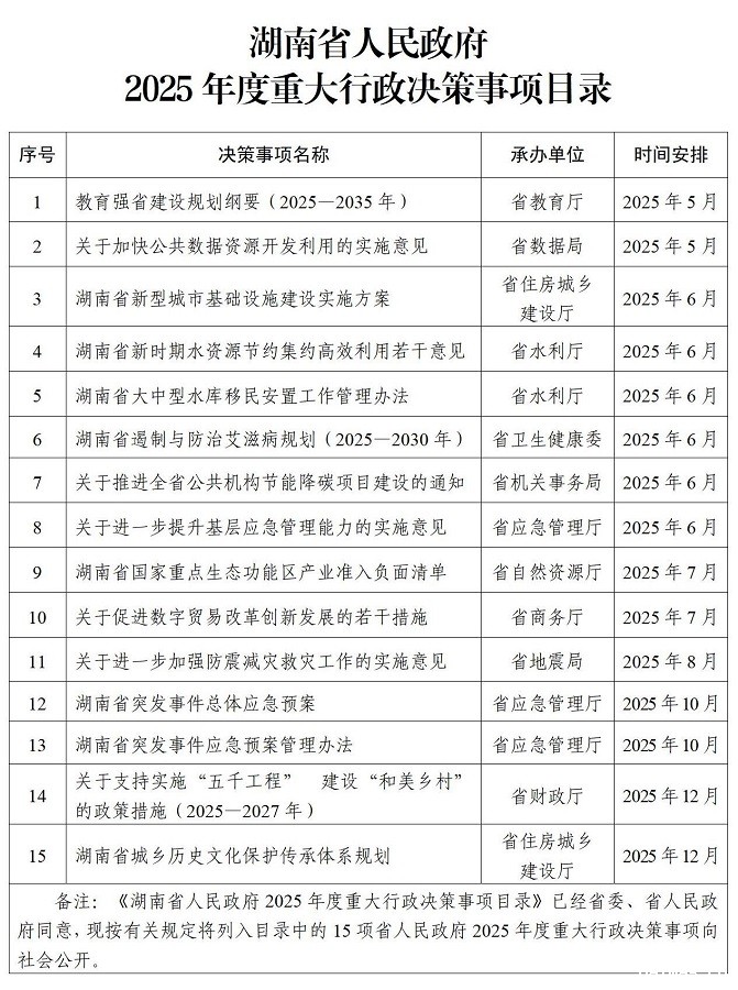 《湖南省人民政府2025年度重大行政决策事项目录》已经省委、省人民政府同意,现印发给你们,请结合实际抓好贯彻落实。