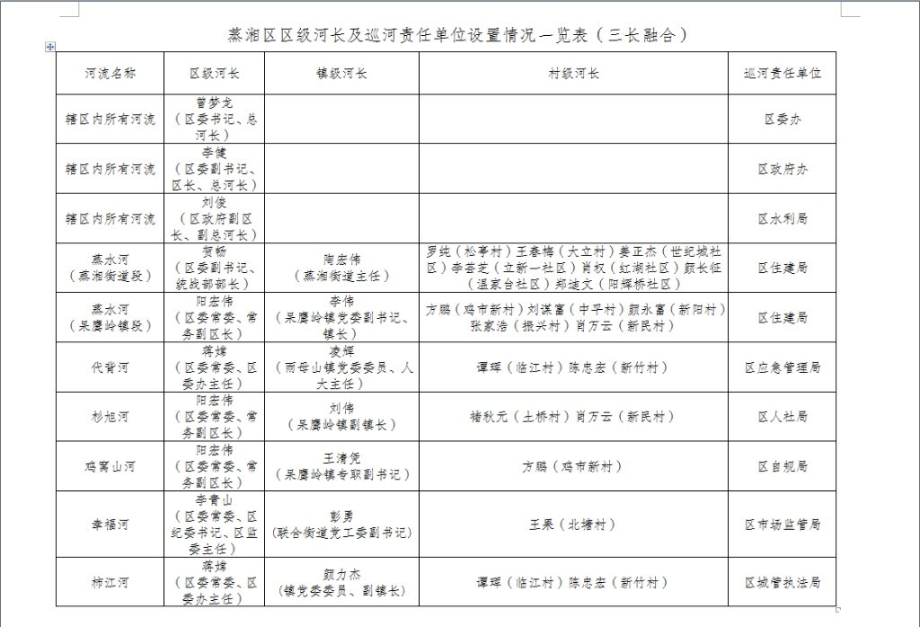2023年蒸湘区三级河长名单及巡河责任单位情况公示