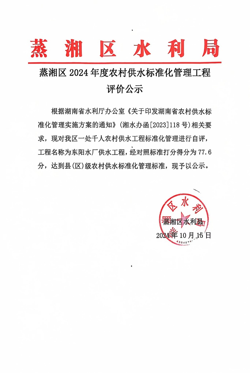蒸湘区2024年度农村供水标准化管理工程评价公示
