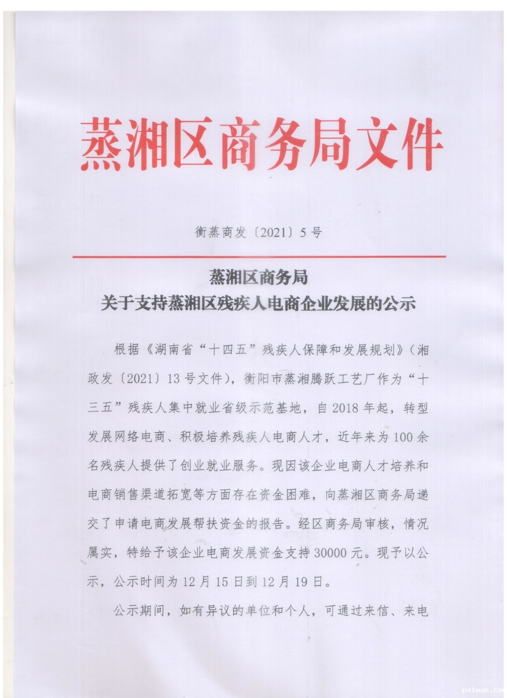 关于支持蒸湘区残疾人电商企业发展的公示