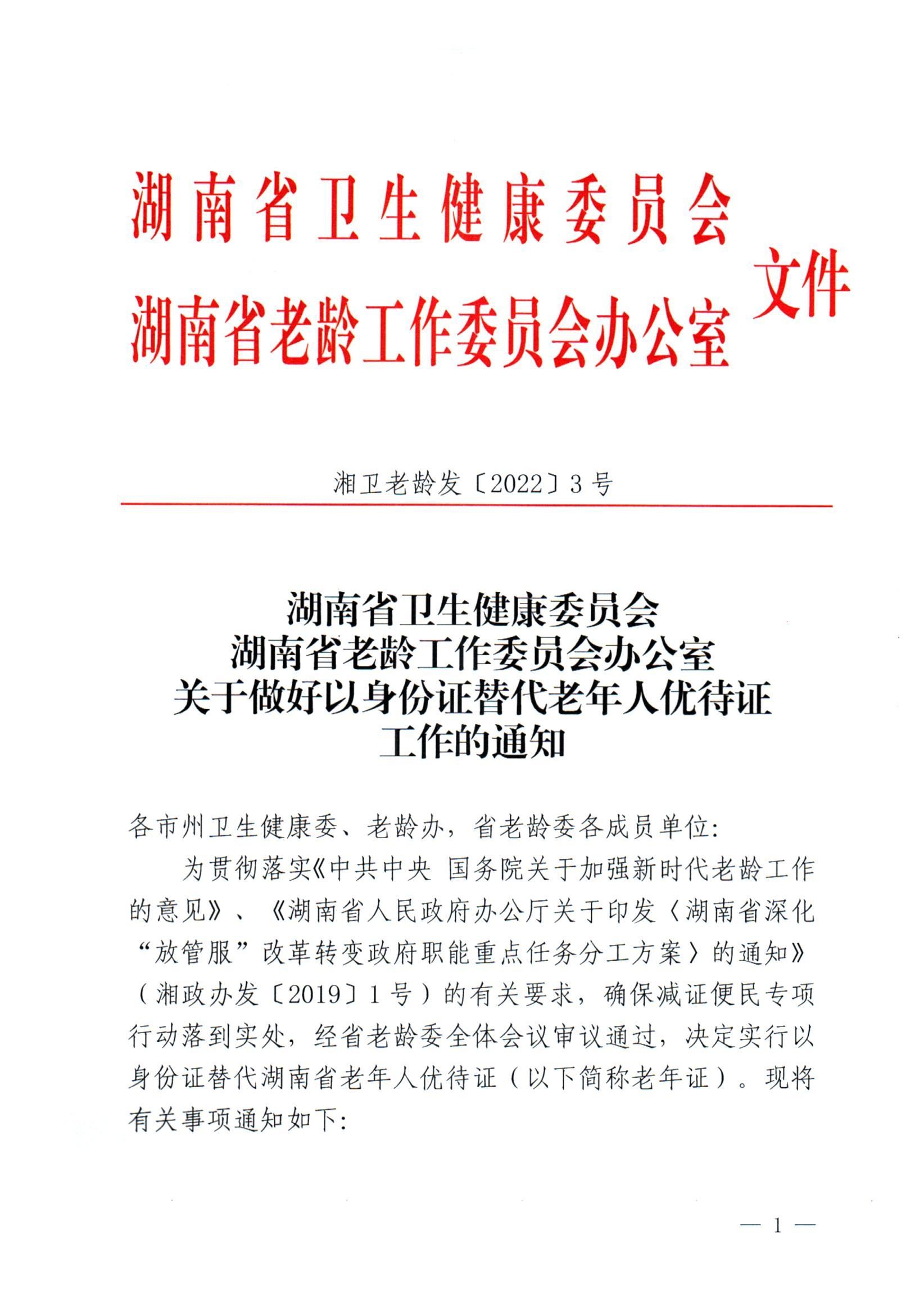 转发《湖南省卫生健康委员会 湖南省老龄工作委员会办公室关于做好以身份证替代老年人优待证工作的通知》的通知