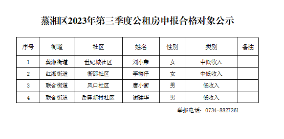 蒸湘区2023年第三季度公租房申报合格对象公示