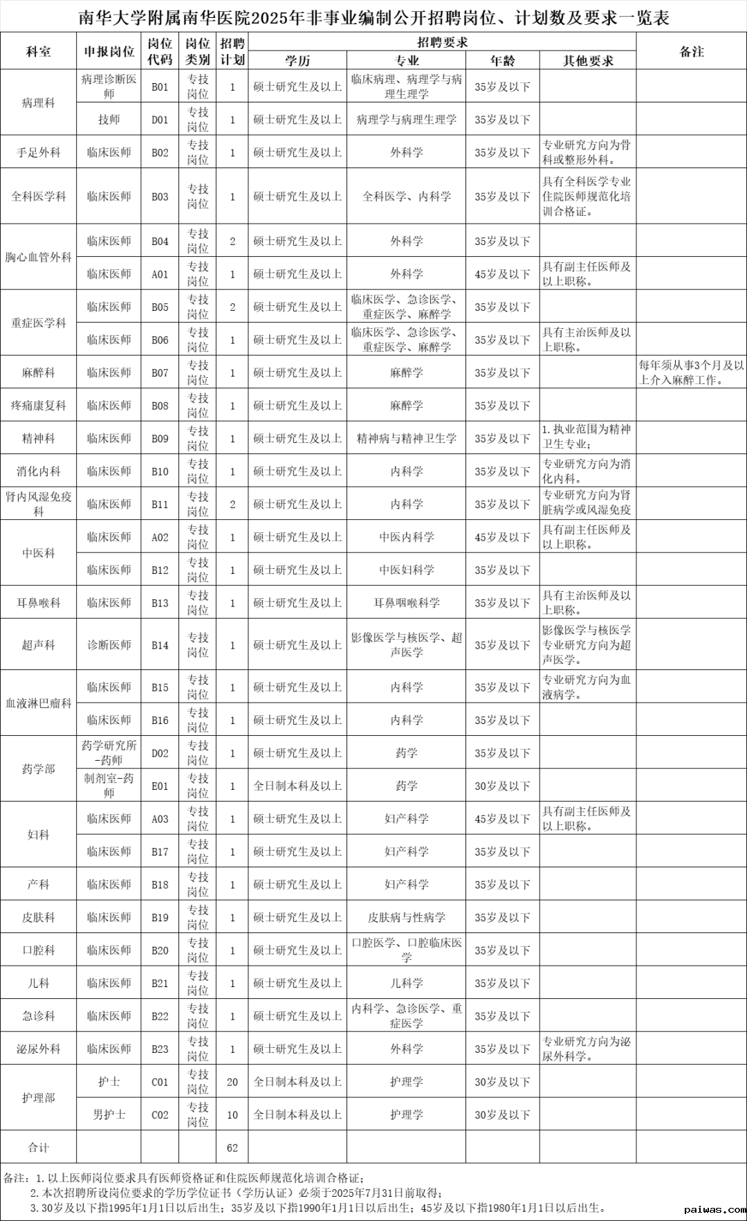 招聘岗位、计划及要求 此次招聘岗位31个,招聘计划62名,均为专业技术岗位。 报名 1.报名时间 A类岗位:即日起至2025年12月31日24:00。随到随招,招满即止。 B、C、D、E类岗位:即日起至2025年5月5日17:00。 2.报名方式 网上报名。每人限报一个岗位,多报则取消应聘资格。请应聘人员登录南华大学附属南华医院网站→人才招聘→报名入口,进入“南华大学附属南华医院招聘报名系统”,按应聘流程填写相关个人信息,并按岗位要求提交报名所需资料。 应聘人员应对自己所填报资料的真实性负责,凡弄虚作假者、多报者,一经查实,则取消应聘资格。未按期提交材料或逾期材料不齐者,视为自动放弃应聘资格。如出现因个人填写信息错误导致资格审查未通过的,责任由应聘人员本人承担。 更多公告详情