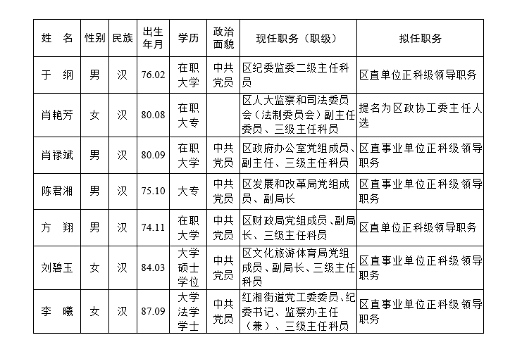 为了加强对干部选拔工作的监督,提高识别和任用干部的准确程度,现对区委常委会会议研究决定的下列7名拟任人选进行任前公示: