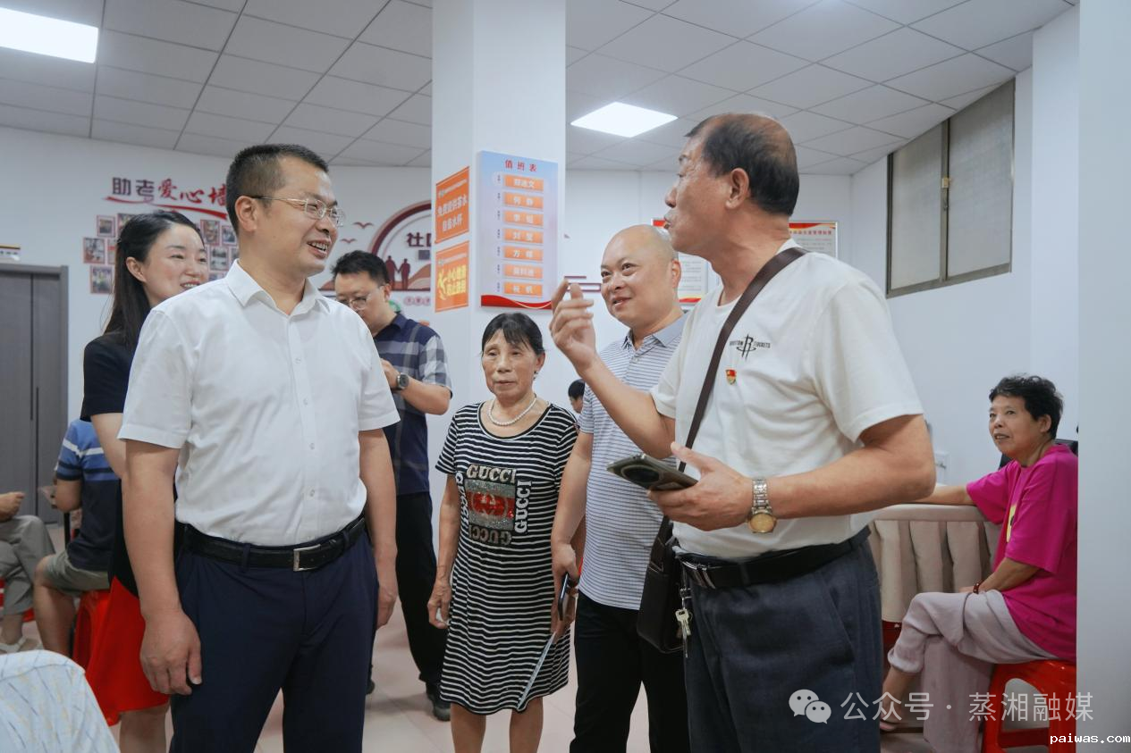 ▲在祥光社区与小区老党员交谈,听取意见建议。